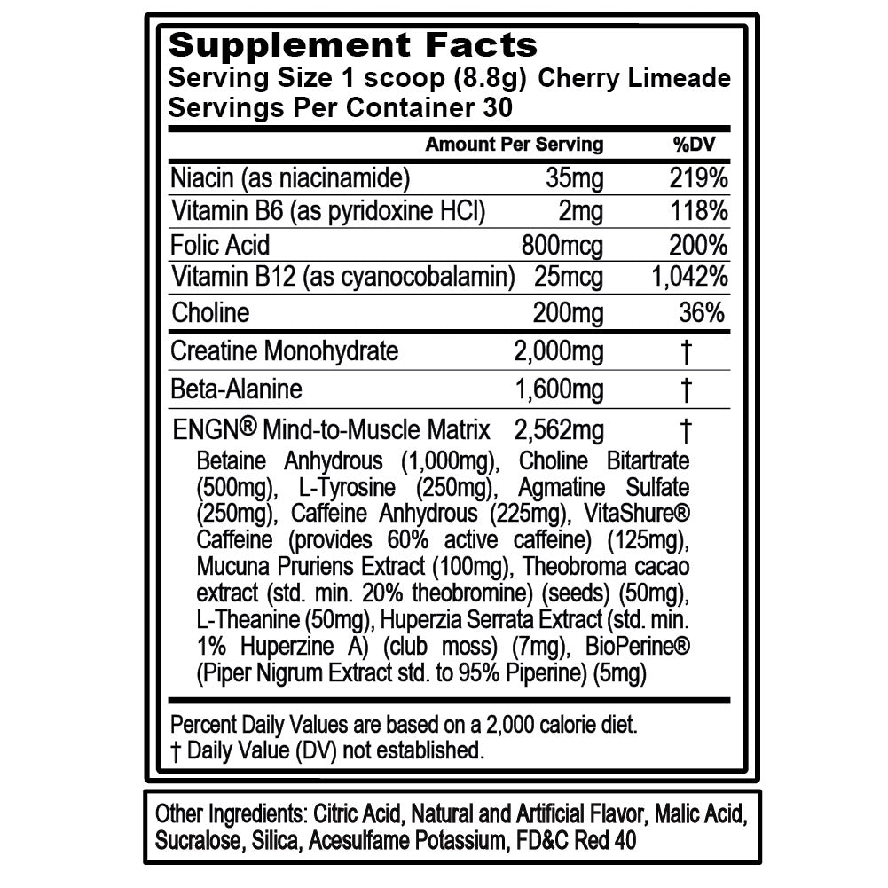 Constant improvement requires a winning trifecta of building strength, increasing blood flow and extending endurance so you can reach the next level. Key ingredients including Carnosyn Beta-Alanine, Betaine, Agmass, L-Tyrosine and Creatine are the foundation of ENGN’s complete formula. Together, they supply the most advanced ingredients to get you pumped, powered up and dialed-in so you can train harder every workout session.