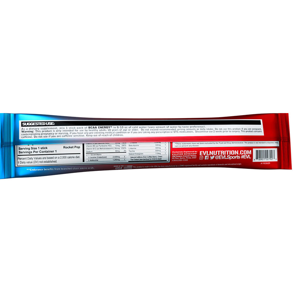 As a dietary supplement, take 1 sample packet of BCAA Energy in 8-10 oz of cold water (vary amount of water by taste preference). BCAA Energy contains caffeine and Beta-Alanine. Beta-Alanine can create a temporary tingling feeling on your skin. This is normal and diminishes with continued use. Warning: This product is intended for us by healthy adults 18 years of age or older. Do not use this product if you have any pre-existing or suspected medical condition, or if you are taking prescription or OTC medication. Not for use by women who are pregnant, nursing or trying to get pregnant. Discontinue use 2 weeks prior to surgery. Do not use if you are caffeine sensitive. Do not exceed daily recommended serving amount of 3 scoops. Keep out of reach of children. *These statements have not been evaluated by the Food and Drug Administration. This product is not intended to diagnose, treat, cure or prevent any disease.