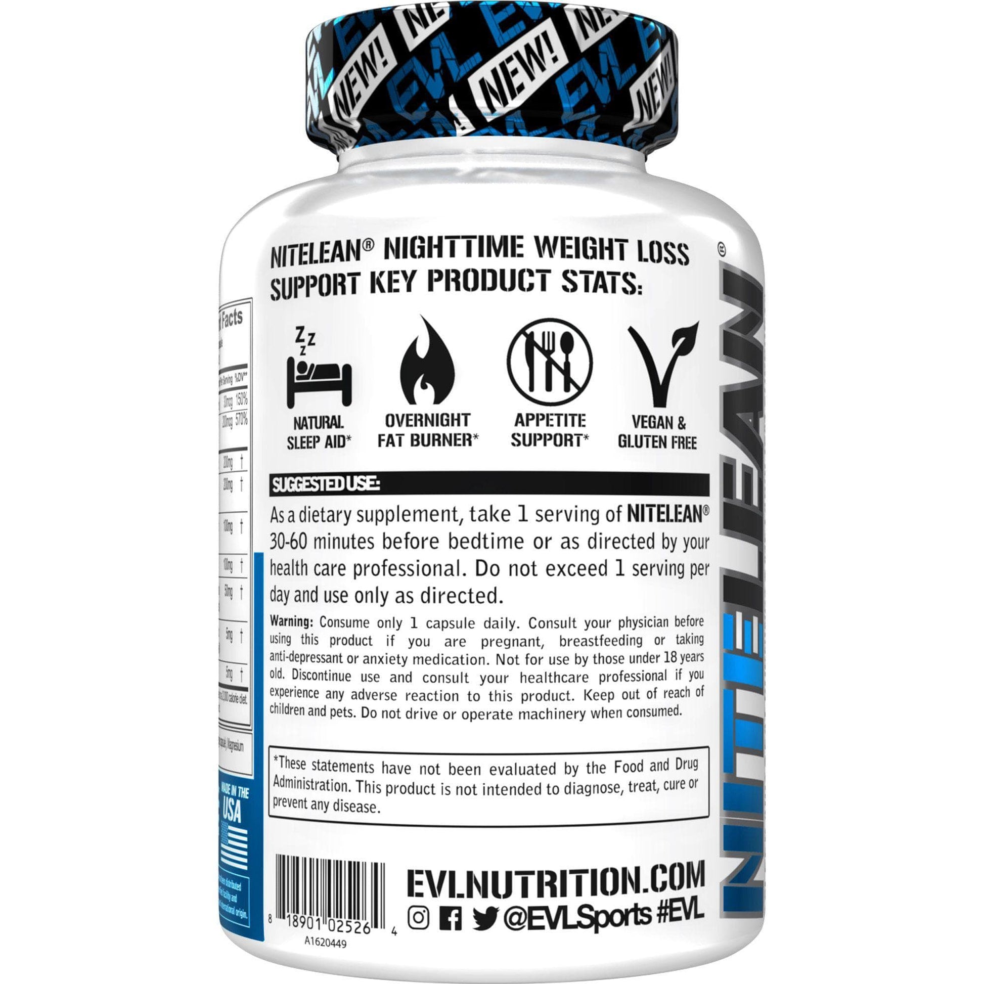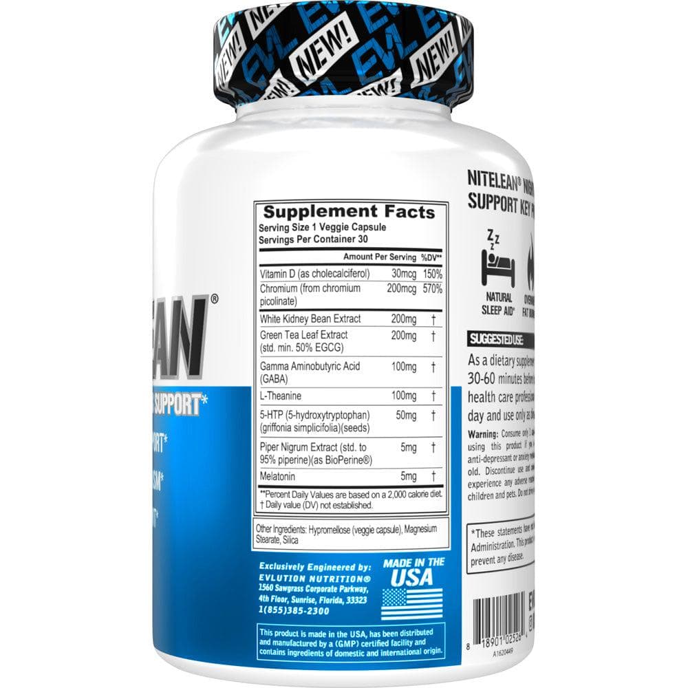 As a dietary supplement, take 1 serving of NITELEAN® 30-60 minutes before bedtime or as directed by your health care professional. Do not exceed 1 serving per day and use only as directed. Warning: Consume only 1 capsule daily. Consult your physician before using this product if you are pregnant, breastfeeding or taking anti-depressant or anxiety medication. Not for use by those under 18 years old. Discontinue use and consult your healthcare professional if you experience any adverse reaction to this product. Keep out of reach of children and pets. Do not drive or operate machinery when consumed. * These statements have not been evaluated by the Food and Drug Administration. This product is not intended to diagnose, treat, cure or prevent any disease.